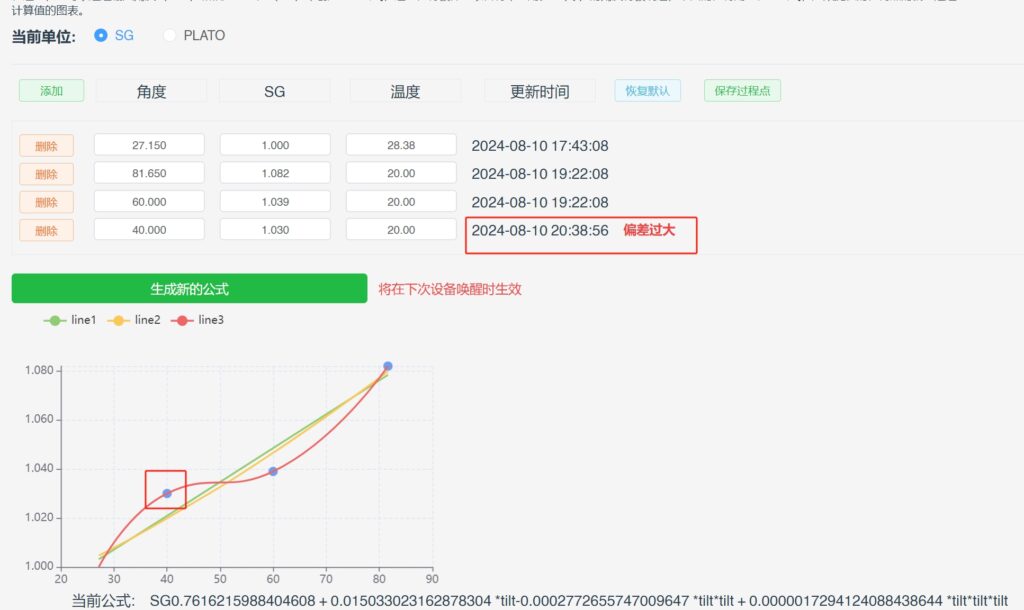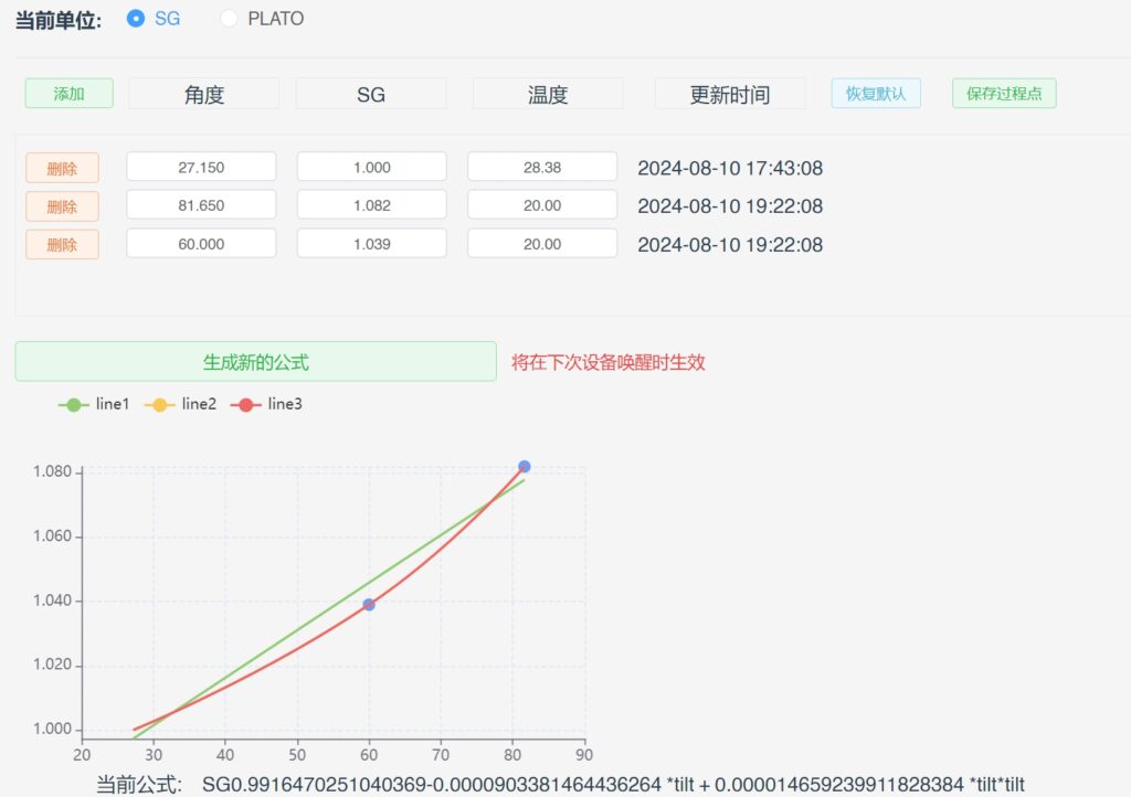 - 发酵中途测量比重值,通过收到测量比重值,在校准公式中填入当前的角度值和测量得到的比重值。这将得到一个3阶的公式